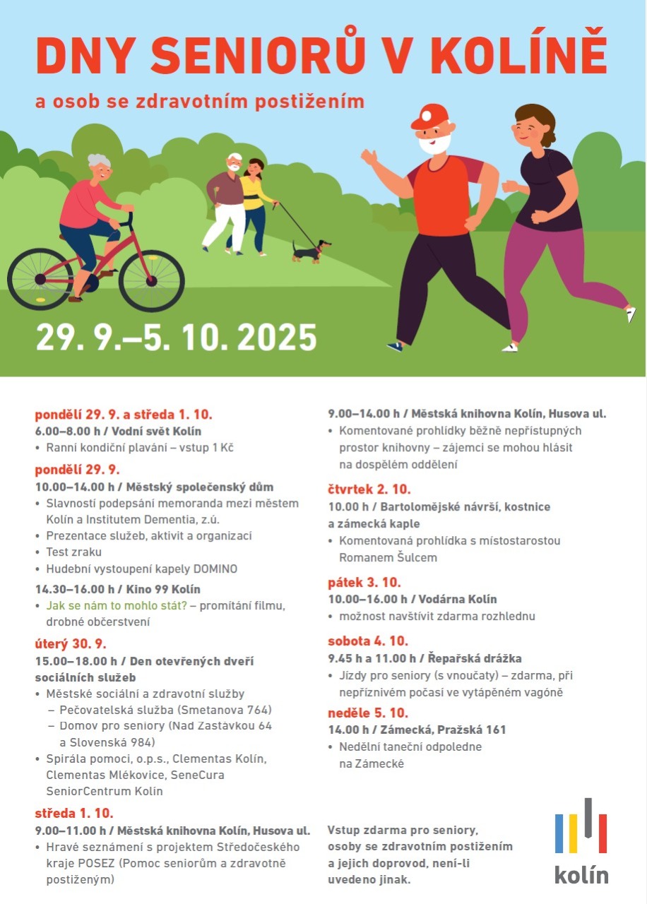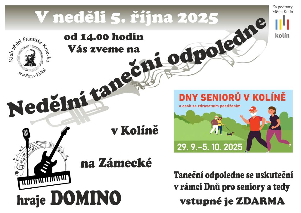 Od 29. 9. do 5. 10. 2025 se v Kolíně konají Dny seniorů a osob se zdravotním postižením a na závěr celého týdne se Městský úřad rozhodl uspořádat naše tradiční Taneční odpoledne, na kterém zahraje oblíbená kapela DOMINO. Tuto zábavu budou mít všichni senioři v rámci celotýdenních akcí ZDARMA.